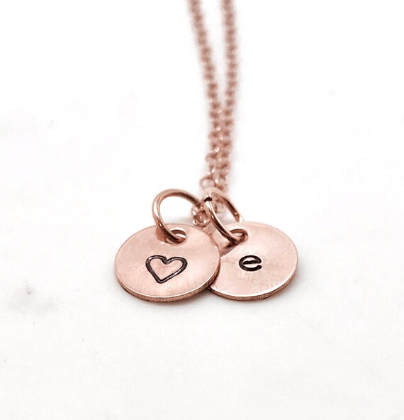 Rose Gold Initial Necklace With Heart Charm Letter E Etsy