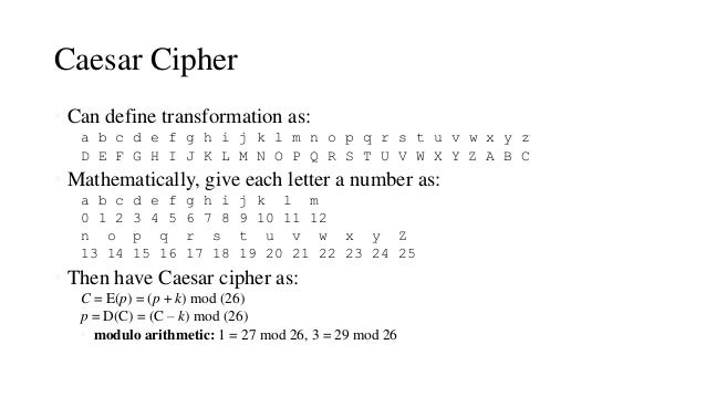 Another way to crypt more mathematical note A0 B1 Z25 and add a constant the shift then the result modulo 26 alphabet length is the coded text. Two great mods of the Caeser Cipher are the AtBash Code where you reverse the alphabet so AZ BY CX etc or replacing each letter with a number A1 B2 C3 etc.